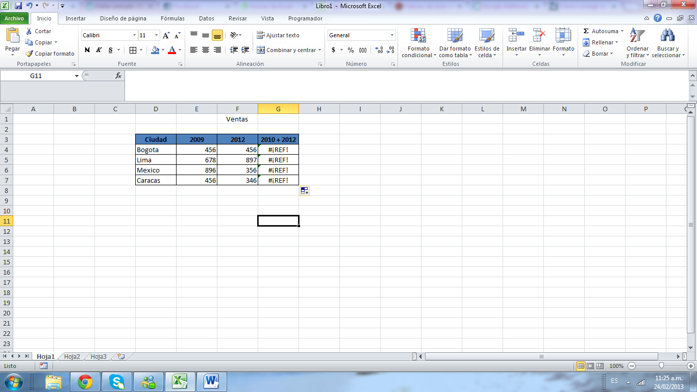 Ej: tenemos la siguiente tabla de Ventas de diferentes ciudades, y en el momento de copiar la tabla a otro sitio suprimimos los datos del 2010 cuando Excel busca la celda se encuentra con datos diferentes y le falta una columna para hacer la operación 2010 +2012