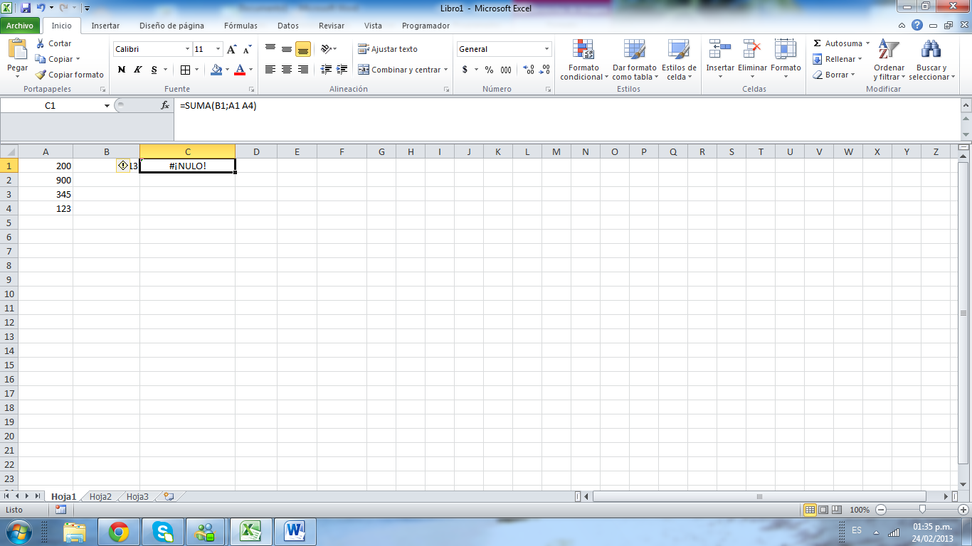 - los rangos no se interceptan Solución: Para hacer referencia a dos áreas que no forman intersección usar el operador de unión ejemplo utilice punto y coma (;) para unirlos Ej: SUMA(A1:A10 ;B1:B10)